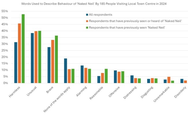 In 2024 I commissioned a survey assessing how people visiting my local high street felt about me. The most common response amongst people who had seen me was “harmless”, and the most common response amongst people who hadn’t seen me was “unusual”. The full survey results were: