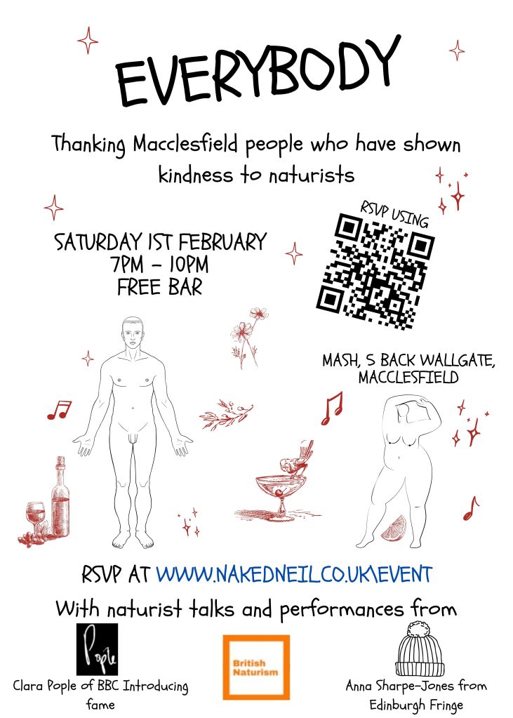 Everybody was an event held in February 2025 to thank the owners and employees of businesses in my hometown for showing me and some of my naturist friends kindness and acceptance over the last few years. A local bar hosted us, and naturist performers provided the entertainment for around 110 dressed guests. A big thanks to: